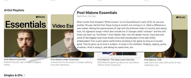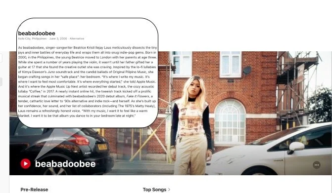 Providing context and depth: Our assignments spanned a massive swath of genres including catalog and trending music, and an essential function of my role was maintaining a team that had SMEs to create the most compelling content for each assignment. We delivered notes for playlist franchises that were designed to let listeners travel as far into an artist’s catalog as they wanted (from essentials into deep cuts), and introduce them to each artist’s inspirations, impact, and contemporaries. Over an eight-year span, we delivered more than 10,000 sets of notes, which included versions localized for the US, UK, Canada, and Australia.