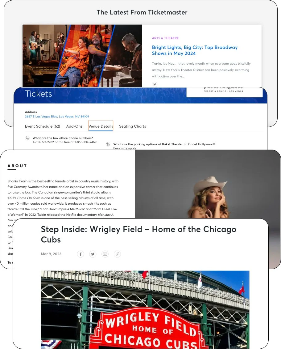 Driving site stickiness: Ticketmaster had launched a new content marketing initiative to improve brand perception and to encourage site visitors to use their platform for more than transactions. On the blog, they sought SEO-driven service content that would provide dining and and leisure suggestions to help users plan stays in new cities. On the website, they needed to flesh out venue pages with information about amenities (such as parking and ADA accommodations). They also needed bios on pages for artists, teams, and athletes. During a three-year contract, we delivered thousands of pieces of content in support of their mission. (From top: Blog post; venue FAQs; artist bio; venue deep dive)